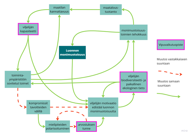 Tässä tutkimuksessa etsittiin ratkaisuja käyttämällä osallistavaa järjestelmäkartoitusta (Causal Loop Diagrams) ja syviä vipupisteitä – keskeisiä kohtia, joissa muutoksella voi olla suurin vaikutus. Tutkimukseen osallistuivat viljelijät, viranomaiset ja luonnon monimuotoisuuden asiantuntijat, jotka tunnistivat haasteita ja mahdollisuuksia maatalousmaan ekologisen tilan parantamiseen.